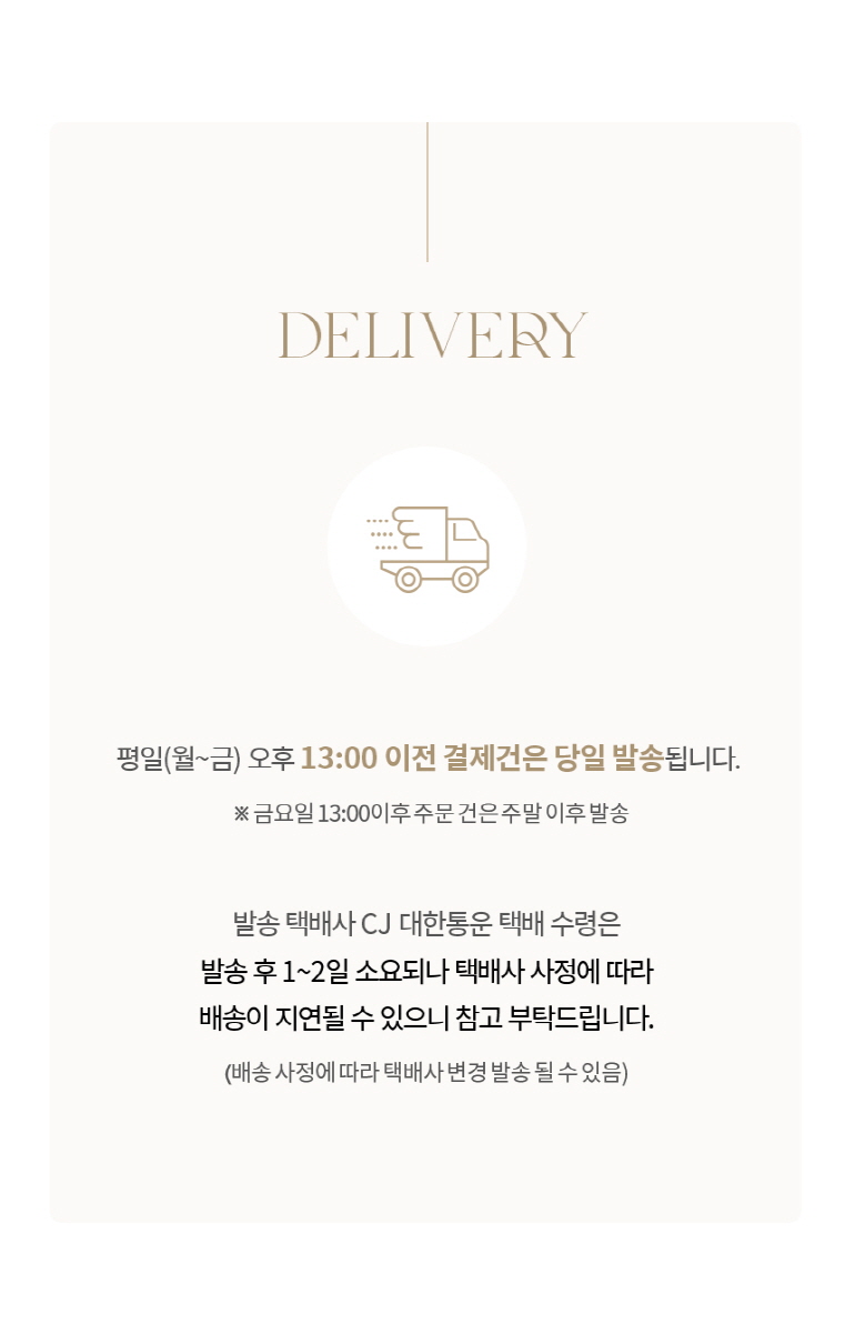 - ÁÖ¹®µÈ »óǰÀº Á¦Ç°°ú ¼ö·®¿¡ µû¶ó ´Ù¼Ò Â÷À̰¡ ÀÖÀ¸³ª, º¸Åë ¹ßÁÖ ÀϷκÎÅÍ 3~7ÀÏ À̳» ¹è¼ÛÀ» ¿øÄ¢À¸·Î ÇÕ´Ï´Ù. (µµ¼»ê°£Áö¿ªÀÇ °æ¿ì¿¡´Â 1~2ÀÏÀÌ Ãß°¡·Î ¼Ò¿äµÉ ¼ö ÀÖ½À´Ï´Ù.)